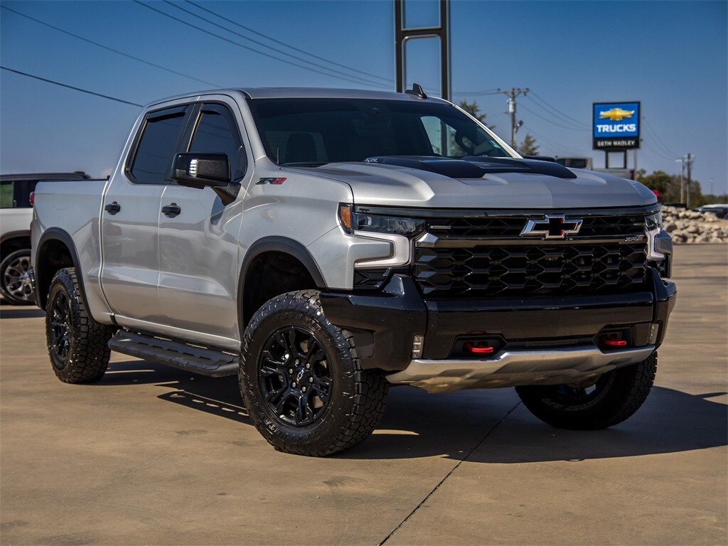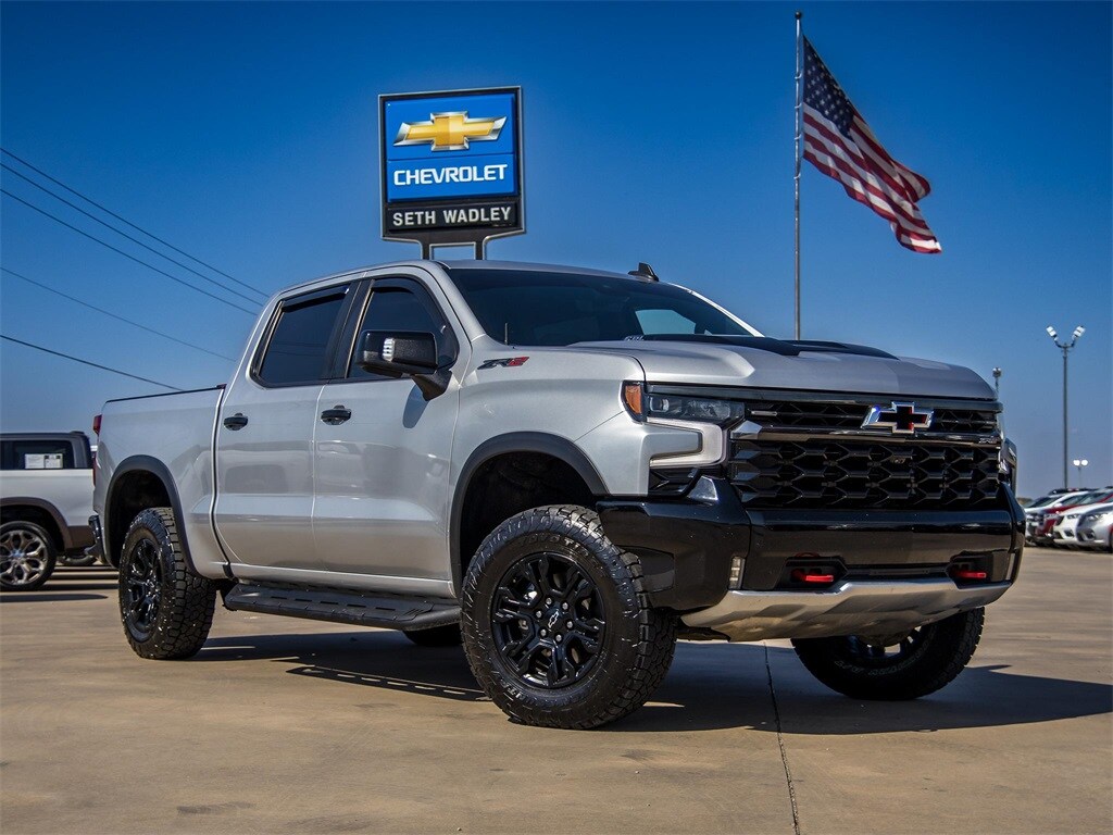 Certified. 2022 Silver Ice Metallic Chevrolet Silverado 1500 ZR2 4WD 10-Speed Automatic EcoTec3 6.2L V8 This Chevrolet Silverado 1500 has many features and is well equipped including, Lifetime Engine Guarantee, Lifetime Oil Changes, Accident Free Carfax, Carfax One-Owner, 10-Way Power Driver Seat w/Lumbar, 10-Way Power Passenger Seat Adjuster w/Lumbar, 12.3" Multicolor Reconfigurable Digital Display, 120-Volt Bed Mounted Power Outlet, 120-Volt Instrument Panel Power Outlet, 15" Diagonal Multicolor Head-Up Display, 170 Amp Alternator, 2 USB Data Ports, 2nd Row Heated Outboard Seats, 4-Wheel Disc Brakes, 7 Speakers, ABS brakes, Adaptive Cruise Control, Air Conditioning, All-Weather Floor Liner (LPO), AM/FM radio: SiriusXM with 360L, Apple CarPlay/Android Auto, Auto High-beam Headlights, Auto-dimming door mirrors, Auto-Dimming Inside Rear-View Mirror, Auto-dimming Rear-View mirror, Auto-Locking Rear Differential, Automatic Emergency Braking, Automatic temperature control, Bed View Camera, Bluetooth® For Phone, Brake assist, Chevrolet Connected Access Capable, Chevytec Spray-On Black Bedliner, Color-Keyed Carpeting Floor Covering, Compass, Deep-Tinted Glass, Delay-off headlights, Driver door bin, Driver Memory, Driver vanity mirror, Dual Exhaust, Dual front impact airbags, Dual front side impact airbags, Dual Rear USB Ports (Charge Only), Electric Rear-Window Defogger, Electrical Steering Column Lock, Electronic Cruise Control, Electronic Stability Control, Electronic Transmission Range Selector Shifter, EZ Lift Power Lock & Release Tailgate, Floor Mounted Center Console, Following Distance Indicator, Forward Collision Alert, Front anti-roll bar, Front Bucket Seats, Front Center Armrest, Front dual zone A/C, Front fog lights, Front LED Fog Lamps, Front License Plate Kit, Front Pedestrian Braking, Front Rainsensing Wipers, Front reading lights, Front wheel independent suspension, Fully automatic headlights, Garage door transmitter, HD Surround Vision, Heated door mirrors, Heated Driver & Front Outboard Passenger Seats, Heated front seats, Heated rear seats, Heated Steering Wheel, Heated steering wheel, Heavy-Duty Air Filter, High Gloss Black Mirror Caps, Hill Descent Control, Hitch Guidance, Hitch Guidance w/Hitch View, Illuminated entry, Integrated Trailer Brake Controller, IntelliBeam Automatic High Beam On/Off, Keyless Open & Start, Lane Keep Assist w/Lane Departure Warning, Leather Wrapped Steering Wheel, LED Cargo Area Lighting, Low tire pressure warning, Manual Tilt/Telescoping Steering Column, Memory seat, Multi-Flex Tailgate, Not Equipped w/Steering Column Lock, Occupant sensing airbag, OnStar & Chevrolet Connected Services Capable, Outside Heated Power-Adjustable Mirrors, Outside temperature display, Overhead airbag, Overhead console, Panic alarm, Passenger door bin, Passenger vanity mirror, Perforated Leather Seat Trim, Performance Red Recovery Hooks, Perimeter Lighting, Power door mirrors, Power driver seat, Power Front Passenger Windows w/Express Up/Down, Power Front Windows w/Driver Express Up/Down, Power passenger seat, Power Rear Windows w/Express Down, Power Sliding Rear Window w/Rear Defogger, Power steering, Power Sunroof, Power Tilt & Telescoping Steering Column, Power windows, Preferred Equipment Group 3LT, Premium audio system: Chevrolet Infotainment 3 Premium, Premium Bose 7-Speaker Sound System, Radio data system, Radio: Chevrolet Infotainment 3 Premium System, Rain sensing wipers, Rear Camera Mirror, Rear Cross Traffic Alert-Braking, Rear Park Assist, Rear Pedestrian Detection, Rear reading lights, Rear seat center armrest, Rear step bumper, Rear Wheelhouse Liners, Rear window defroster, Remote keyless entry, Remote Vehicle Starter System, Rocker Protector (LPO), Safety Alert Seat, Security system, SiriusXM w/360L, Speed control, Speed-sensing steering, Split folding rear seat, Standard Tailgate, Steering Wheel Audio Controls, Steering wheel mounted audio controls, Tachometer, Technology Package, Telescopin