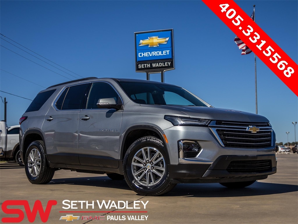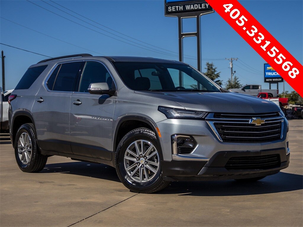Certified. 2023 Sterling Gray Metallic Chevrolet Traverse LT Cloth w/2FL FWD 9-Speed Automatic 3.6L V6 SIDI VVT This Chevrolet Traverse has many features and is well equipped including, Lifetime Engine Guarantee, Lifetime Oil Changes, Accident Free Carfax, Bluetooth, Non-Smoker, Carfax One-Owner, Great Fuel Economy, Keyless Entry, Navigation / GPS, Rear Backup Camera, Remote Start, Tow Package, USB, Bluetooth Hands Free, 2-Way Manual Front Passenger Seat Adjuster, 3rd row seats: split-bench, 4-Wheel Disc Brakes, 6 Speakers, 6-Speaker Audio System Feature, 8-Way Power Driver Seat Adjuster, ABS brakes, Air Conditioning, Alloy wheels, AM/FM radio: SiriusXM, Apple CarPlay/Android Auto, Auto High-beam Headlights, Automatic temperature control, Brake assist, Bumpers: body-color, Compass, Delay-off headlights, Driver door bin, Driver vanity mirror, Dual front impact airbags, Dual front side impact airbags, Electronic Stability Control, Emergency communication system, Exterior Parking Camera Rear, Four wheel independent suspension, Front anti-roll bar, Front Bucket Seats, Front Center Armrest, Front dual zone A/C, Front License Plate Bracket Mounting Package, Front reading lights, Fully automatic headlights, Heated door mirrors, Illuminated entry, Leather steering wheel, Low tire pressure warning, Not Equipped w/Rear Park Assist (060), Occupant sensing airbag, Outside temperature display, Overhead airbag, Overhead console, Panic alarm, Passenger door bin, Passenger vanity mirror, Power door mirrors, Power Driver Lumbar Control, Power driver seat, Power steering, Power windows, Premium Cloth Seat Trim, Radio data system, Radio: Chevrolet Infotainment System AM/FM Stereo, Rear air conditioning, Rear anti-roll bar, Rear reading lights, Rear window defroster, Rear window wiper, Remote keyless entry, Security system, SiriusXM Radio, Speed control, Speed-sensing steering, Spoiler, Steering wheel mounted audio controls, Tachometer, Telescoping steering wheel, Tilt steering wheel, Traction control, Trip computer, Turn signal indicator mirrors, Variably intermittent wipers, Voltmeter, Wheels: 18" Bright Silver-Painted Aluminum.