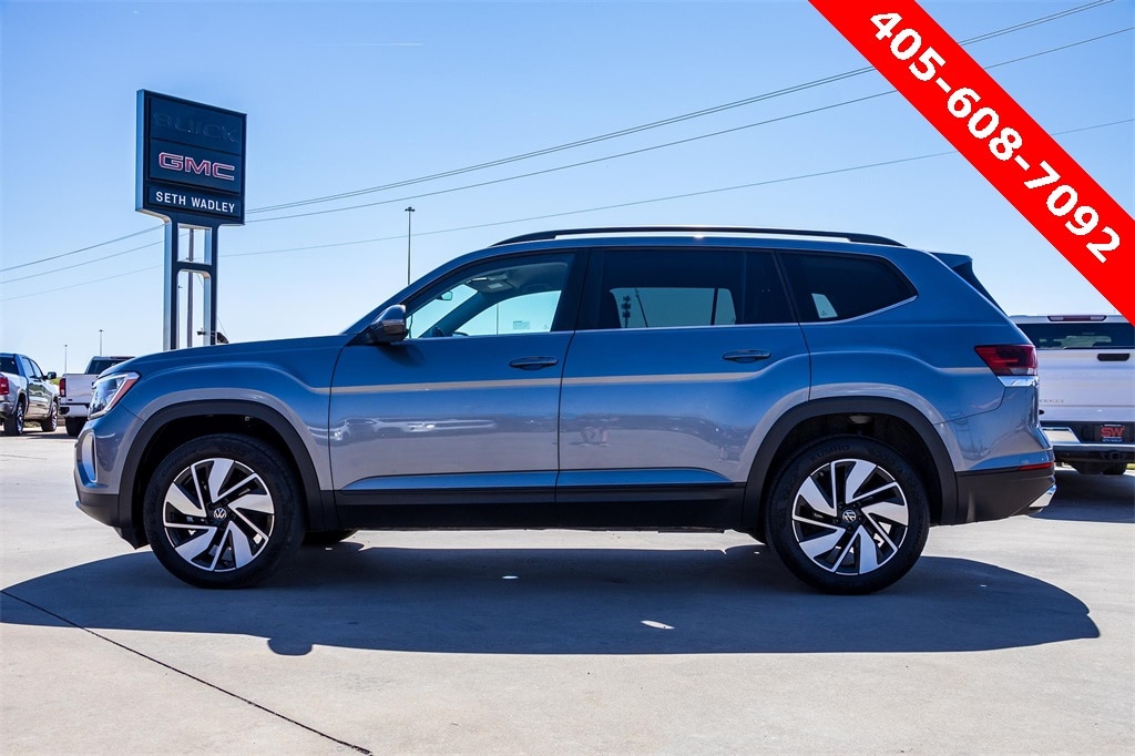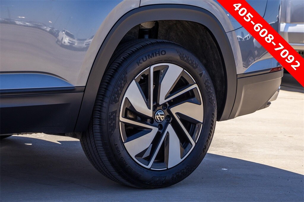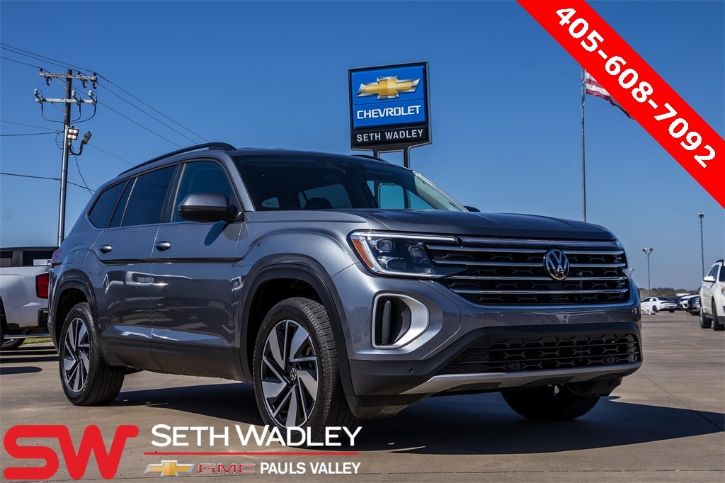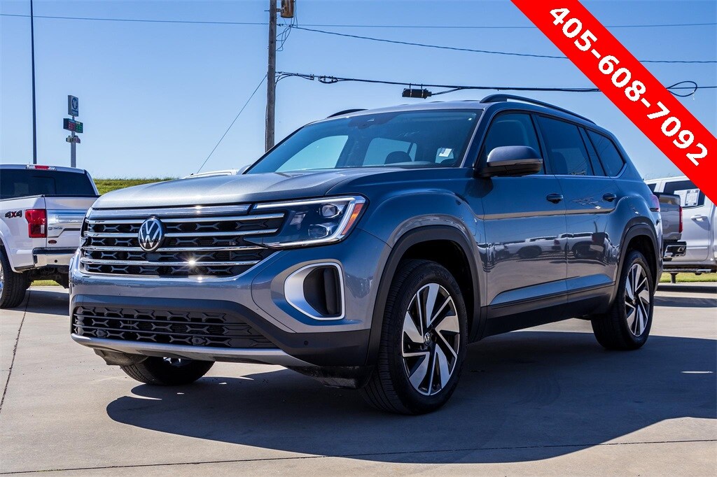Certified. 2025 Silver Mist Metallic Volkswagen Atlas 2.0T SE w/Technology AWD 8-Speed Automatic with Tiptronic 2.0L TSI This Volkswagen Atlas has many features and is well equipped including, Lifetime Engine Guarantee, Lifetime Oil Changes, Accident Free Carfax, Bluetooth, Carfax One-Owner, Heated / Cooled Seats, Keyless Entry, Rear Backup Camera, **SIRIUS/XM SATELLITE RADIO**, USB, Bluetooth Hands Free, 3rd row seats: split-bench, 4-Wheel Disc Brakes, 6 Speakers, ABS brakes, Air Conditioning, Alloy wheels, AM/FM radio: SiriusXM with 360L, Auto High-beam Headlights, Auto-dimming Rear-View mirror, Automatic temperature control, Brake assist, Bumpers: body-color, Compass, Delay-off headlights, Driver door bin, Driver vanity mirror, Dual front impact airbags, Dual front side impact airbags, Electronic Stability Control, Emergency communication system: VW Car-Net Safe & Secure 5-year, Exterior Parking Camera Rear, Four wheel independent suspension, Four-wheel Independent Suspension, Front anti-roll bar, Front Bucket Seats, Front Center Armrest, Front dual zone A/C, Front fog lights, Front reading lights, Fully automatic headlights, Heated & Actively Ventilated Front Bucket Seats, Heated door mirrors, Heated front seats, Heated steering wheel, Illuminated entry, Low tire pressure warning, Occupant sensing airbag, Outside temperature display, Overhead airbag, Overhead console, Panic alarm, Passenger door bin, Passenger vanity mirror, Perforated V-Tex Leatherette Seating Surfaces, Power door mirrors, Power driver seat, Power Liftgate, Power steering, Power windows, Radio data system, Radio: MIB3 Composition Media, Rain sensing wipers, Rear air conditioning, Rear anti-roll bar, Rear reading lights, Rear seat center armrest, Rear window defroster, Rear window wiper, Remote keyless entry, Security system, Speed control, Speed-sensing steering, Split folding rear seat, Spoiler, Steering wheel mounted audio controls, Tachometer, Telescoping steering wheel, Tilt steering wheel, Traction control, Trip computer, Turn signal indicator mirrors, Variably intermittent wipers, Ventilated front seats, Wheels: 20" 2-Tone Machined Alloy.