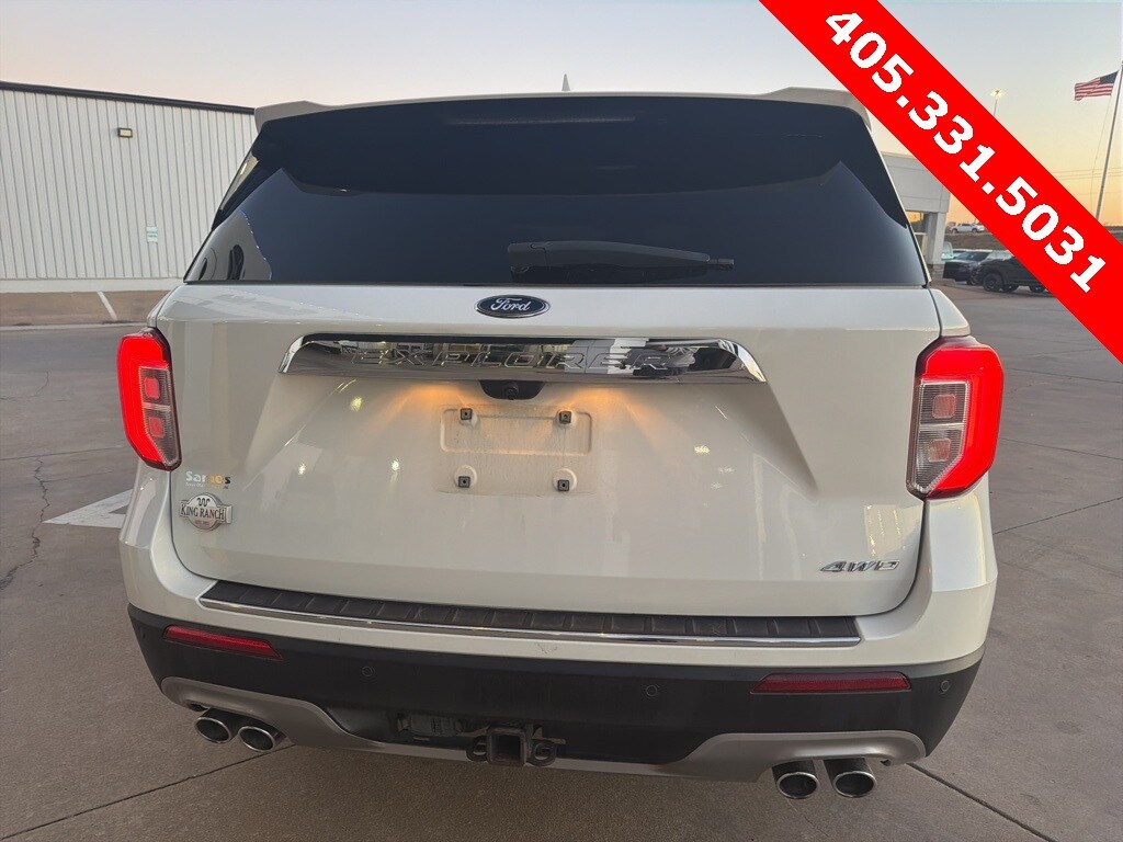 Recent Arrival! 2021 Oxford White Ford Explorer King Ranch 4WD 10-Speed Automatic 3.0L EcoBoost V6 This Ford Explorer has many features and is well equipped including, Lifetime Engine Guarantee, Lifetime Oil Changes, Accident Free Carfax, Bluetooth, Heated / Cooled Seats, Keyless Entry, Leather, Navigation / GPS, Power Sunroof / Moonroof, Rear Backup Camera, Remote Start, **SIRIUS/XM SATELLITE RADIO**, All Wheel Drive / 4x4, USB, Bluetooth Hands Free, 10.1" LCD Capacitive Portrait Touchscreen, 12 Speakers, 2 Additional Speakers, 3.31 Non-Limited-Slip Axle Ratio, 3rd row seats: bench, 4-Wheel Disc Brakes, ABS brakes, Air Conditioning, Alloy wheels, AM/FM radio: SiriusXM, Auto High-beam Headlights, Auto-dimming door mirrors, Auto-dimming Rear-View mirror, Automatic temperature control, Brake assist, Bumpers: body-color, Compass, Delay-off headlights, Driver door bin, Driver vanity mirror, Dual front impact airbags, Dual front side impact airbags, Electronic Stability Control, Emergency communication system: SYNC 3 911 Assist, Equipment Group 701A, Exterior Parking Camera Rear, FordPass Connect, Four wheel independent suspension, Front anti-roll bar, Front Bucket Seats, Front Center Armrest, Front dual zone A/C, Front fog lights, Front reading lights, Fully automatic headlights, Garage door transmitter: HomeLink, Genuine wood dashboard insert, Heated door mirrors, Heated front seats, Heated rear seats, Heated steering wheel, Illuminated entry, Knee airbag, Leather steering wheel, Low tire pressure warning, Memory seat, Mesa Del Rio Lthr Htd/Vent Capt's Chairs, Navigation System, Occupant sensing airbag, Outside temperature display, Overhead airbag, Overhead console, Panic alarm, Passenger door bin, Passenger vanity mirror, Power door mirrors, Power driver seat, Power Liftgate, Power passenger seat, Power steering, Power windows, Premium Technology Package, Radio data system, Radio: B&O Sound System by Bang & Olufsen, Rain sensing wipers, Rear air conditioning, Rear anti-roll bar, Rear reading lights, Rear window defroster, Rear window wiper, Remote keyless entry, Roof rack: rails only, Security system, SelectShift Capability w/Paddle Shifters, Speed control, Speed-sensing steering, Speed-Sensitive Wipers, Split folding rear seat, Spoiler, Steering wheel memory, Steering wheel mounted audio controls, SYNC 3 Communications & Entertainment System, SYNC 3/Apple CarPlay/Android Auto, Tachometer, Telescoping steering wheel, Tilt steering wheel, Traction control, Trip computer, Turn signal indicator mirrors, Twin Panel Moonroof, Variably intermittent wipers, Ventilated front seats, Voice-Activated Touchscreen Navigation System, Wheels: 20" 10-Spoke Aluminum w/KR Center Cap.