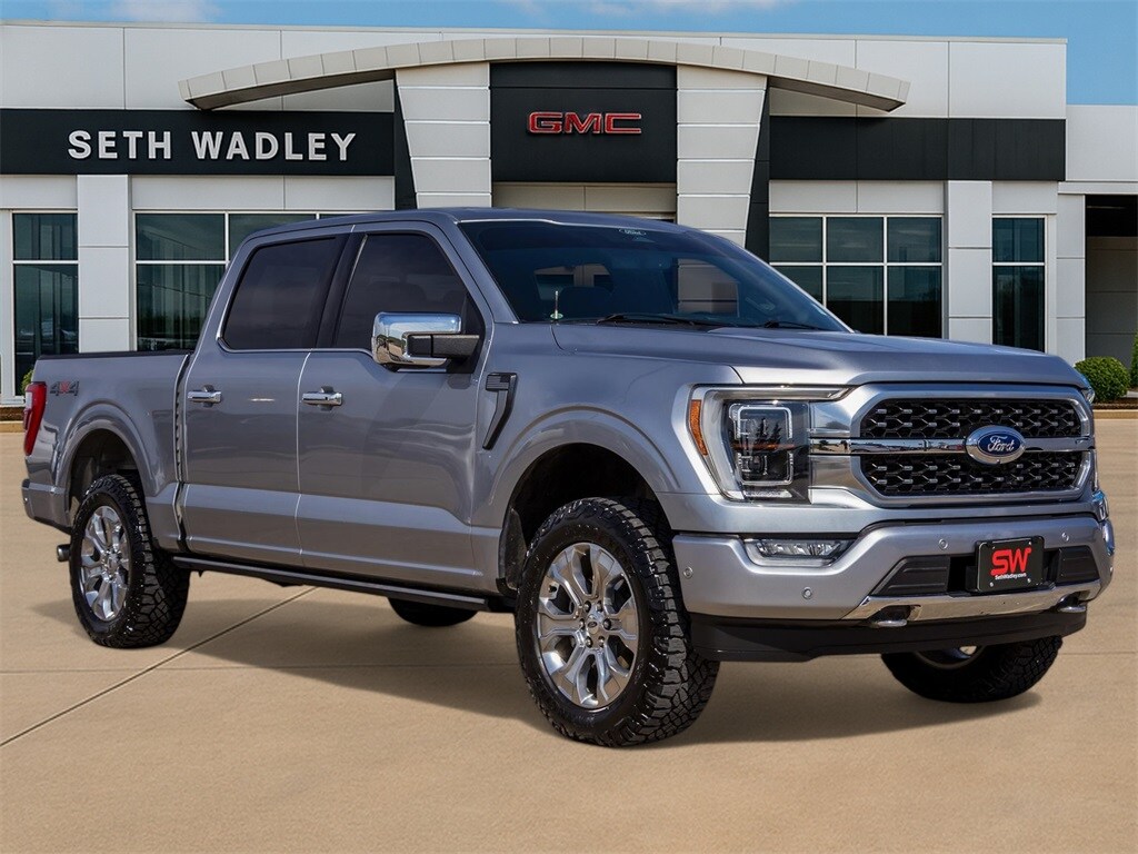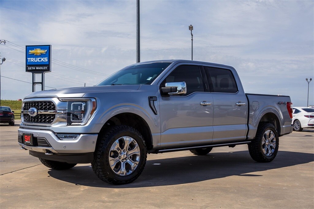 2022 Iconic Silver Metallic Ford F-150 Platinum 4WD 10-Speed Automatic 3.5L V6 EcoBoost This Ford F-150 has many features and is well equipped including, Lifetime Engine Guarantee, Lifetime Oil Changes, Window Tint, Spray In Bed Liner, Accident Free Carfax, Bluetooth, Non-Smoker, Heated Mirrors, Heated / Cooled Seats, Keyless Entry, Leather, Local Trade, Navigation / GPS, Rear Backup Camera, Rear Backup Sensors, Remote Start, **SIRIUS/XM SATELLITE RADIO**, Tow Package, All Wheel Drive / 4x4, USB, Bluetooth Hands Free, 20" Polished Aluminum Wheels, 3.31 Axle Ratio, 360 Degree Camera, 4-Wheel Disc Brakes, 8 Speakers, ABS brakes, Active Park Assist 2.0, Active Park Assist 2.0 Removal, Adjustable pedals, Air Conditioning, Alloy wheels, AM/FM radio: SiriusXM with 360L, Auto High-beam Headlights, Auto Start-Stop Removal, Auto tilt-away steering wheel, Auto-dimming door mirrors, Auto-dimming Rear-View mirror, Automatic temperature control, Bed Utility Package, BlueCruise, BoxLink, Brake assist, Bumpers: body-color, Class IV Trailer Hitch Receiver, Compass, Delay-off headlights, Driver door bin, Driver vanity mirror, Dual front impact airbags, Dual front side impact airbags, Electronic Stability Control, Emergency communication system: SYNC 4 911 Assist, Equipment Group 701A High, Extended Range 36 Gallon Fuel Tank, Exterior Parking Camera Rear, Ford Co-Pilot360 Active 2.0, Front anti-roll bar, Front Bucket Seats, Front Center Armrest, Front dual zone A/C, Front fog lights, Front License Plate Bracket, Front reading lights, Front wheel independent suspension, Fully automatic headlights, Garage door transmitter, Heated door mirrors, Heated front seats, Heated rear seats, Heated steering wheel, Illuminated entry, Integrated Trailer Brake Controller, Interior Work Surface, LED Box Lighting, Low tire pressure warning, Memory seat, Multicontour Seats w/Active Motion Removal, Occupant sensing airbag, Outside temperature display, Overhead airbag, Overhead console, Panic alarm, Passenger door bin, Passenger vanity mirror, Pedal memory, Power door mirrors, Power driver seat, Power passenger seat, Power steering, Power Tailgate, Power windows, Pro Trailer Backup Assist, Radio data system, Radio: B&O Sound System by Bang & Olufsen, Radio: B&O Unleashed Sound System by Bang & Olufsen, Rain sensing wipers, Rear reading lights, Rear seat center armrest, Rear step bumper, Rear window defroster, Remote keyless entry, Security system, Speed control, Speed-sensing steering, Split folding rear seat, Steering wheel memory, Steering wheel mounted audio controls, SYNC 4 w/Enhanced Voice Recognition, Tachometer, Tailgate Step w/Tailgate Work Surface, Telescoping steering wheel, Tilt steering wheel, Tow Technology Package, Traction control, Tray Style Floor Liner, Trip computer, Turn signal indicator mirrors, Variably intermittent wipers, Ventilated front seats, Voltmeter.