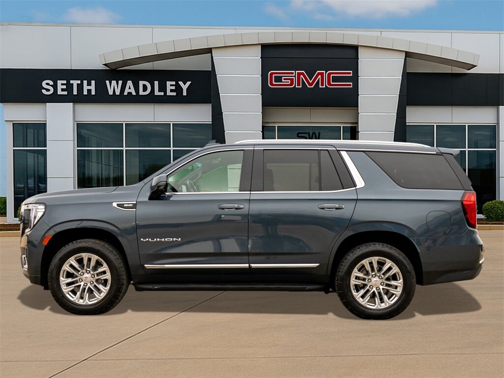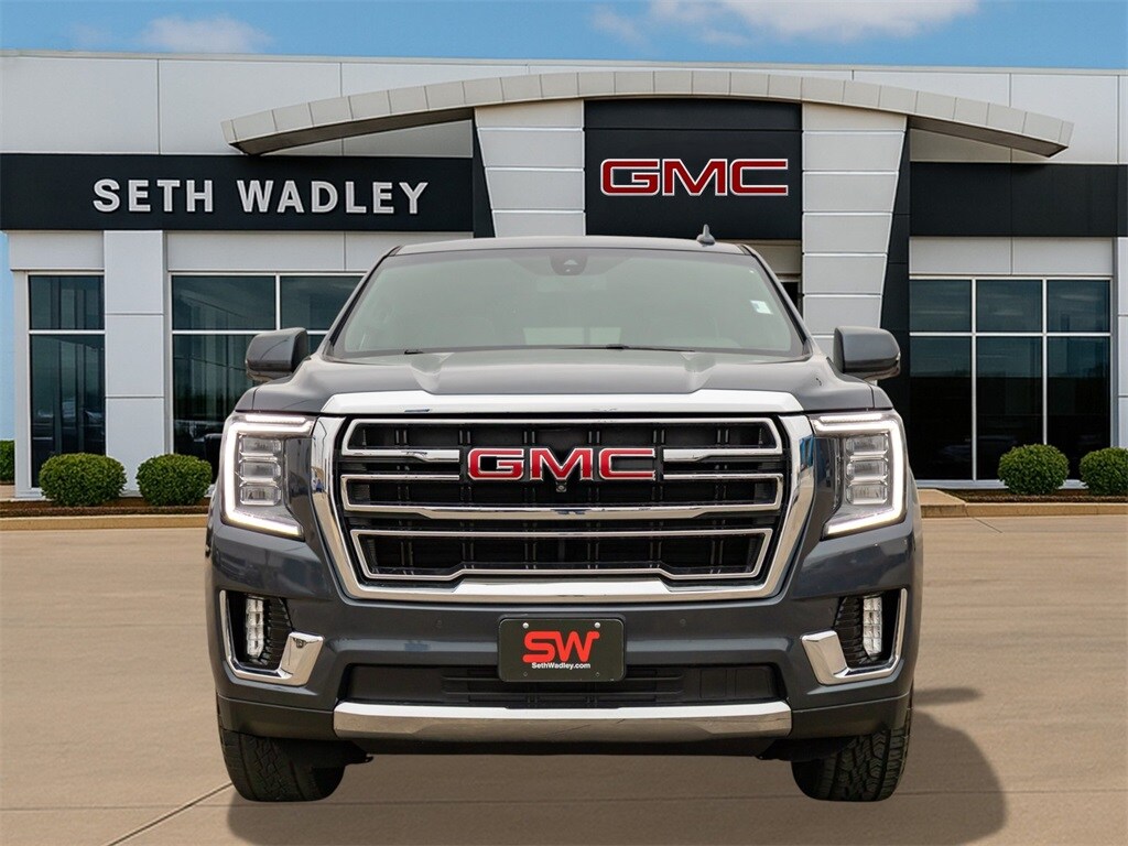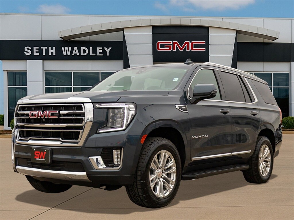 Certified. 2021 Dark Sky Metallic GMC Yukon SLT 4WD 10-Speed Automatic with Overdrive EcoTec3 5.3L V8 This GMC Yukon has many features and is well equipped including, Lifetime Engine Guarantee, Lifetime Oil Changes, Bluetooth, Heated / Cooled Seats, Keyless Entry, Leather, Power Sunroof / Moonroof, Rear Backup Camera, Remote Start, **SIRIUS/XM SATELLITE RADIO**, All Wheel Drive / 4x4, USB, Bluetooth Hands Free, 12-Way Power Seat Adjusters, 1st, 2nd & 3rd Row All-Weather Floor Liner (LPO), 2 Presets For Outside Rearview Mirrors, 2 Presets For Power Driver Seat, 3.23 Rear Axle Ratio, 3rd Row 60/40 Power-Folding Split-Bench Seat, 3rd row seats: split-bench, 4-Wheel Disc Brakes, 9 Speakers, ABS brakes, Air Conditioning, Alloy wheels, AM/FM radio: SiriusXM with 360L, Apple CarPlay/Android Auto, Auto High-beam Headlights, Auto-dimming Rear-View mirror, Automatic Emergency Braking, Automatic temperature control, Bodyside moldings, Bose 9-Speaker Stereo Audio System Feature, Brake assist, Bright Chrome Bodyside Moldings, Bright Front & Rear Door Sill Plates, Bumpers: body-color, Chrome Door Handles w/Body-Color Strip, Compass, Delay-off headlights, Driver door bin, Driver vanity mirror, Dual front impact airbags, Dual front side impact airbags, Dual-Pane Panoramic Power Sunroof, Electronic Stability Control, Emergency communication system: OnStar and GMC connected services capable, Extra Capacity Cooling System, Following Distance Indicator, Forward Collision Alert, Four wheel independent suspension, Front & Rear Park Assist, Front anti-roll bar, Front Bucket Seats, Front Center Armrest, Front dual zone A/C, Front fog lights, Front Pedestrian Braking, Front reading lights, Fully automatic headlights, Garage door transmitter, Hands-Free Power Programmable Rear Liftgate, HD Radio, HD Surround Vision, Heated & Ventilated Driver & Front Passenger Seats, Heated 2nd Row Outboard Position Seats, Heated Automatic Steering Wheel, Heated door mirrors, Heated Driver & Front Passenger Seats, Heated front seats, Hitch Guidance w/Hitch View, Illuminated entry, In-Vehicle Trailering App, Inside Rear-View Auto-Dimming Mirror, Integrated Trailer Brake Controller, IntelliBeam Automatic High Beam On/Off, Lane Change Alert w/Side Blind Zone Alert, Lane Keep Assist w/Lane Departure Warning, Leather steering wheel, License Plate Front Mounting Package, Low tire pressure warning, Max Trailering Package, Memory seat, Occupant sensing airbag, Outside Heated Power-Adjustable Mirrors, Outside temperature display, Overhead airbag, Overhead console, Panic alarm, Passenger door bin, Passenger vanity mirror, Perforated Leather Seating Surfaces, Power door mirrors, Power driver seat, Power Liftgate, Power passenger seat, Power Release 2nd Row 60/40 Split-Folding Bench Seat, Power Release 2nd Row Bucket Seats, Power steering, Power Tilt & Telescopic Steering Column, Power windows, Preferred Equipment Group 4SA, Premium Smooth Ride Suspension, Radio: AM/FM/SiriusXM, Rain sensing wipers, Rear air conditioning, Rear anti-roll bar, Rear Cross Traffic Alert, Rear Pedestrian Alert, Rear reading lights, Rear seat center armrest, Rear window defroster, Rear window wiper, Remote keyless entry, Roof rack: rails only, Safety Alert Seat, Security system, SiriusXM w/360L, SLT Luxury Package, SLT Luxury Plus Package (DISC), Speed control, Speed-sensing steering, Split folding rear seat, Spoiler, Steering wheel mounted audio controls, Tachometer, Telescoping steering wheel, Tilt steering wheel, Traction control, Trailer Side Blind Zone Alert, Trip computer, Universal Home Remote, Variably intermittent wipers, Ventilated front seats, Voltmeter, Wheels: 20" x 9" 6-Spoke Polished Aluminum.