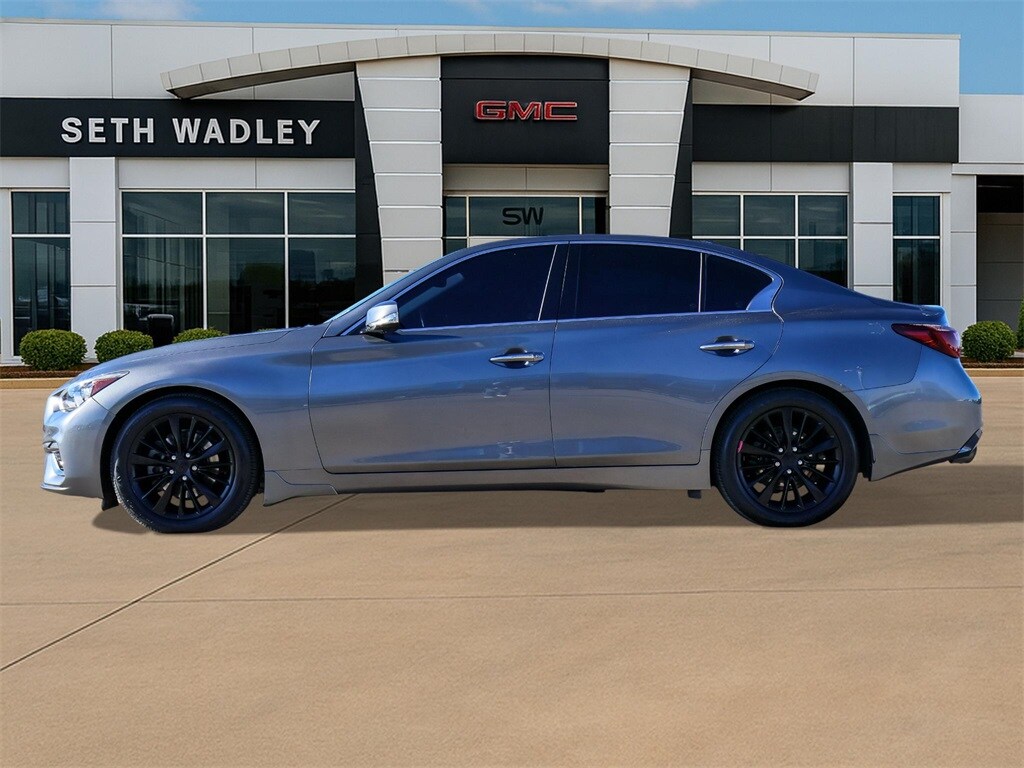 2022 Graphite Shadow INFINITI Q50 LUXE RWD 7-Speed Automatic with Overdrive 3.0L V6 This INFINITI Q50 has many features and is well equipped including, Lifetime Engine Guarantee, Lifetime Oil Changes, Bluetooth, Keyless Entry, Leather, Rear Backup Camera, **SIRIUS/XM SATELLITE RADIO**, USB, Bluetooth Hands Free, 16 Speakers, 18" x 7.5" Aluminum Alloy Wheels, 4-Wheel Disc Brakes, ABS brakes, Air Conditioning, All Weather Package, All-Season Floor Mats, Alloy wheels, AM/FM radio: SiriusXM, Apple CarPlay/Android Auto, Auto High-beam Headlights, Auto tilt-away steering wheel, Auto-dimming Rear-View mirror, Automatic temperature control, Blind Spot Warning, Brake assist, Bumpers: body-color, Cargo Net, Cargo Package, CD player, Compass, Delay-off headlights, Driver door bin, Driver vanity mirror, Dual front impact airbags, Dual front side impact airbags, Electronic Stability Control, Emergency communication system: INFINITI Connection, First Aid Kit, Four wheel independent suspension, Front anti-roll bar, Front Bucket Seats, Front Center Armrest, Front dual zone A/C, Front fog lights, Front reading lights, Fully automatic headlights, Garage door transmitter: HomeLink, Heated door mirrors, Heated Front Bucket Seats, Heated front seats, Heated steering wheel, Illuminated entry, INFINITI Radiant Illuminated Kick Plates, INFINITI Radiant Welcome Lighting, Leather Seating Surfaces, Leather Shift Knob, Leather steering wheel, Literature Kit, Low tire pressure warning, Memory seat, Occupant sensing airbag, Outside temperature display, Overhead airbag, Overhead console, Panic alarm, Passenger door bin, Passenger vanity mirror, Power door mirrors, Power driver seat, Power moonroof, Power passenger seat, Power steering, Power windows, Radio data system, Radio: INFINITI InTouch w/AM/FM/HD/CD, Rain sensing wipers, Rear anti-roll bar, Rear reading lights, Rear seat center armrest, Rear USB Charging Ports, Rear window defroster, Remote keyless entry, Security system, Shopping Bag Hooks, Speed control, Speed-Sensitive Wipers, Splash Guards, Split folding rear seat, Steering wheel memory, Steering wheel mounted audio controls, Tachometer, Telescoping steering wheel, Tilt steering wheel, Traction control, Trip computer, Trunk Mat, Trunk Protector, Turn signal indicator mirrors, Variably intermittent wipers.