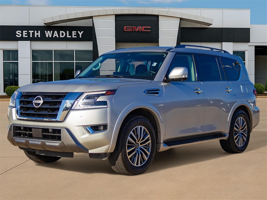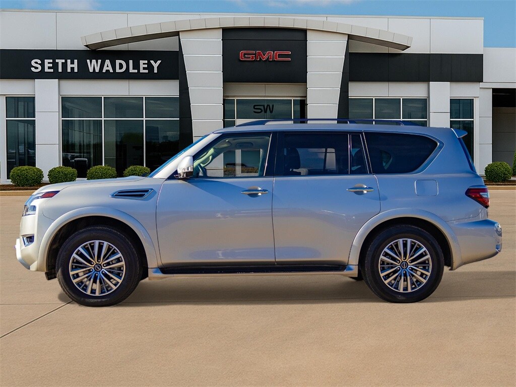 New Price! 2023 Brilliant Silver Metallic Nissan Armada SL RWD 7-Speed Automatic 5.6L V8 DOHC 32V LEV3-ULEV125 400hp This Nissan Armada has many features and is well equipped including, Lifetime Engine Guarantee, Lifetime Oil Changes, Bluetooth, Keyless Entry, Navigation / GPS, Power Sunroof / Moonroof, Rear Backup Camera, **SIRIUS/XM SATELLITE RADIO**, USB, Bluetooth Hands Free, 13 Speakers, 2.94 Axle Ratio, 2nd Row Captain's Chairs, 2nd Row Center Console w/Padded Armrest, 3rd Row Carpeted Floor Mats - Captain Seat, 3rd row seats: split-bench, 4-Wheel Disc Brakes, 6-Speaker Audio System, ABS brakes, Air Conditioning, Alloy wheels, AM/FM radio: SiriusXM, Anti-whiplash front head restraints, Auto High-beam Headlights, Auto tilt-away steering wheel, Auto-dimming door mirrors, Auto-dimming Rear-View mirror, Auto-leveling suspension, Automatic temperature control, Bose 13-Speaker Premium Audio System, Brake assist, Bumpers: body-color, Captain's Chairs Package, Delay-off headlights, Driver door bin, Driver vanity mirror, Dual front impact airbags, Dual front side impact airbags, Electronic Stability Control, Emergency communication system: NissanConnect Services, Exterior Parking Camera Rear, Four wheel independent suspension, Front anti-roll bar, Front Bucket Seats, Front Center Armrest, Front dual zone A/C, Front fog lights, Front reading lights, Fully automatic headlights, Garage door transmitter: HomeLink, Heated door mirrors, Heated Front Bucket Seats, Heated front seats, Heated steering wheel, Illuminated entry, Knee airbag, Leather Shift Knob, Leather-Appointed Seat Trim, Low tire pressure warning, Memory seat, Navigation System, NissanConnect featuring Apple CarPlay and Android Auto, Occupant sensing airbag, Outside temperature display, Overhead airbag, Overhead console, Panic alarm, Passenger door bin, Passenger vanity mirror, Power door mirrors, Power driver seat, Power Liftgate, Power moonroof, Power passenger seat, Power steering, Power windows, Premium audio system: Bose, Radio: NissanConnect w/SiriusXM, Rear air conditioning, Rear anti-roll bar, Rear reading lights, Rear seat center armrest, Rear window defroster, Rear window wiper, Reclining 3rd row seat, Remote keyless entry, Security system, Speed control, Speed-sensing steering, Speed-Sensitive Wipers, Split folding rear seat, Spoiler, Steering wheel memory, Steering wheel mounted audio controls, Tachometer, Telescoping steering wheel, Tilt steering wheel, Traction control, Trip computer, Turn signal indicator mirrors, Variably intermittent wipers, Voltmeter, Wheels: 20" x 8J Painted Alloy.