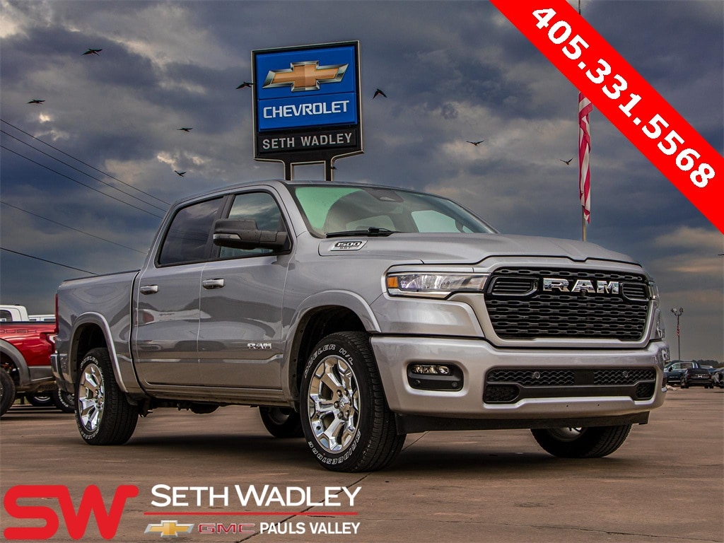 2025 Billet Silver Metallic Clearcoat Ram 1500 Big Horn 4WD 8-Speed Automatic 3.0L I6 This Ram 1500 has many features and is well equipped including, Lifetime Engine Guarantee, Lifetime Oil Changes, Accident Free Carfax, Bluetooth, Keyless Entry, Navigation / GPS, Rear Backup Camera, Rear Backup Sensors, **SIRIUS/XM SATELLITE RADIO**, Tow Package, All Wheel Drive / 4x4, USB, Bluetooth Hands Free, 115V Auxiliary Power Outlet, 115V Auxiliary Rear Power Outlet, 12" Touchscreen Display, 2nd Row In Floor Storage Bins, 3 Rear Seat Head Restraints, 3.55 Rear Axle Ratio, 4 Way Front Headrests, 4-Wheel Disc Brakes, 400W Inverter, 4G LTE Wi-Fi Hot Spot, 6 Speakers, 9 Amplified Speakers w/Subwoofer, ABS brakes, Air Conditioning, Air Conditioning ATC w/Dual Zone Control, AM/FM radio, Anti-Spin Differential Rear Axle, Apple CarPlay, Apple CarPlay/Android Auto, Auto High-beam Headlights, Auto Power-Folding Mirrors, Auto-Dimming Exterior Driver Mirror, Auto-Dimming Rear-View Mirror, Big Horn Level 2 Equipment Group, Black Exterior Mirrors, Black Interior Accents, Black Premium Power Mirrors, Body Color Door Handles, Body Color Front Bumper, Body Color Rear Bumper w/Step Pads, Body Color Tailgate Handle, Brake assist, Bucket Seats, Bumpers: chrome, Cloth Bench Seat, Cluster 7.0" TFT Color Display, Compass, Configurable Drive Mode, Connected Travel & Traffic Services, Connectivity - US/Canada, Convex Wide-Angle Exterior Mirror Insert, Delay-off headlights, Deluxe Cloth Bucket Seats, Driver door bin, Dual front impact airbags, Dual front side impact airbags, Electronic Stability Control, Exterior Mirrors Courtesy Lamps, Exterior Mirrors w/Heating Element, Exterior Mirrors w/Supplemental Signals, Front anti-roll bar, Front Center Armrest w/Storage, Front fog lights, Front reading lights, Front Seat Back Map Pockets, Front wheel independent suspension, Full Length Floor Console, Fully automatic headlights, Glove Box Lamp, Google Android Auto, GPS Antenna Input, GPS Navigation, Grille Surround 1 Body Color Texture 1 Black, HD Radio, Heated door mirrors, Heated Front Seats, Heated Steering Wheel, Illuminated entry, Integrated Voice Command w/Bluetooth, Leather Wrapped Steering Wheel, LED Dome Lamp w/On/Off Switch, LED Footwell Lighting, Low tire pressure warning, Manual Adjust 4-Way Front Passenger Seat, Manual Folding Exterior Mirrors, Media Hub w/2 Charge Only USBs, MOPAR Front & Rear Rubber Floor Mats, Occupant sensing airbag, Outside temperature display, Overhead airbag, Overhead console, Overhead LED Lamps, Panic alarm, ParkView Rear Back-Up Camera, Passenger door bin, Passenger vanity mirror, Power 2-Way Driver Lumbar Adjust, Power Adjust 8-Way Driver Seat, Power Adjustable Pedals, Power door mirrors, Power steering, Power windows, Premium Overhead Console, Quick Order Package 21Z Big Horn, Radio data system, Radio: Uconnect 5 Nav w/12.0" Display, Radio: Uconnect 5 W w/8.4" Display, RAM Grille Badge - Chrome, Rear 60/40 Folding Seat, Rear anti-roll bar, Rear Center Armrest, Rear Power Sliding Window, Rear seat center armrest, Rear step bumper, Rear Window Defroster, Remote keyless entry, Remote Tailgate Release, Security Alarm, SiriusXM w/360L, Speed control, Split folding rear seat, Sport Appearance Package, Steering Wheel Mounted Audio Controls, Sun Visors w/Illuminated Vanity Mirrors, Supplier Part Tracking (J-1), Tachometer, Telescoping steering wheel, Tilt steering wheel, Traction control, Trip computer, Universal Garage Door Opener, USB Host Flip, Variably intermittent wipers, Voltmeter, Wheels: 20" x 9" Aluminum Chrome Clad (WRK).